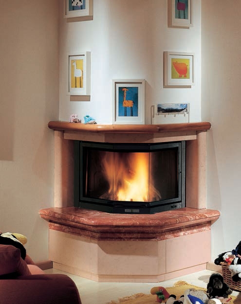 Угловая модель с вертикальными опорами, фасадом и нижними цоколями из мрамора жемчужно-розового цвета, шероховатого/под старину. Плита и вставки из красного мрамора скирос. Деревянная балка.